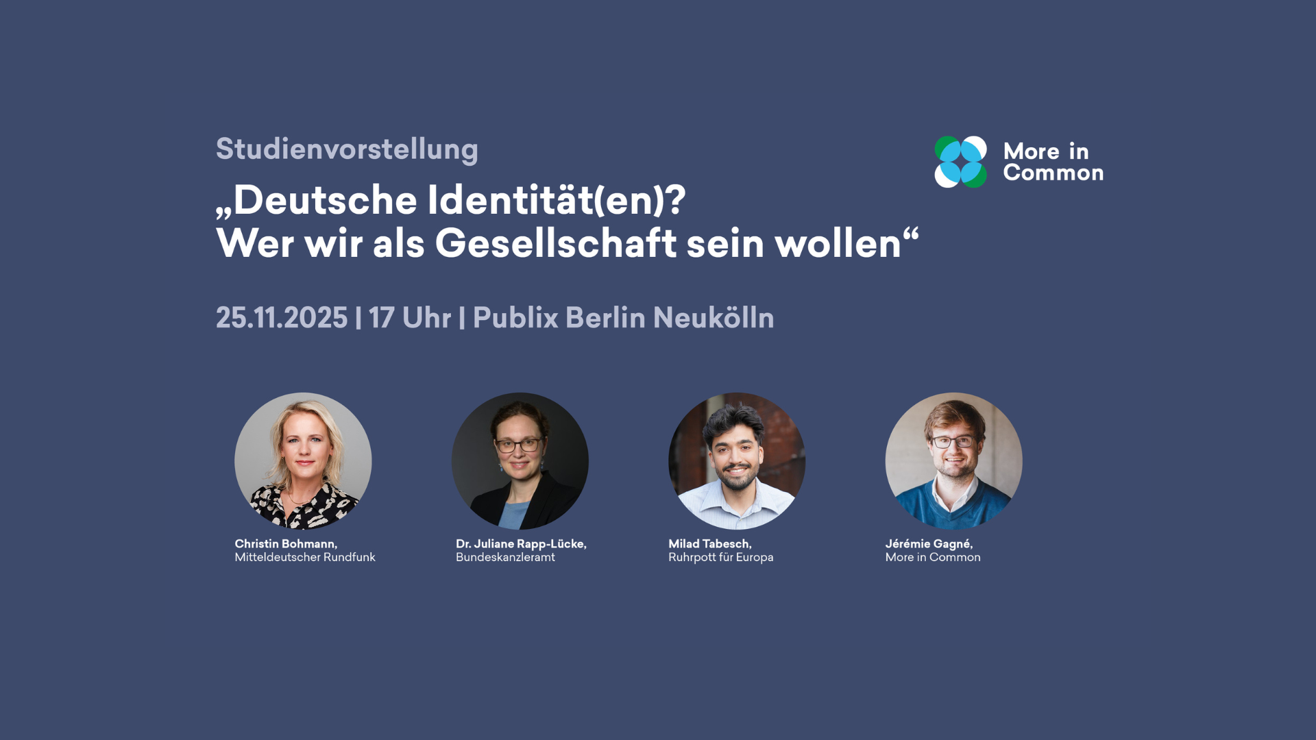 Da wir begrenzte Plätze haben, freuen wir uns über Ihre Anmeldung bis zum 21. November 2025 und eine Absage an deutschland@moreincommon.com für den Fall, dass Sie doch nicht kommen können.